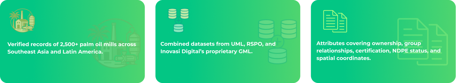 By integrating the Universal Mill List (UML) with Inovasi Digital’s proprietary Global Mill List (GML), the system ensures comprehensive and reliable coverage — capturing even new, unlisted, or restructured mills. Each verified record includes essential attributes such as mill processing capacity, NDPE (No Deforestation, No Peat, No Exploitation) commitments, ownership updates, and current certification statuses, empowering buyers with trusted data to support responsible sourcing, compliance, and transparent reporting.