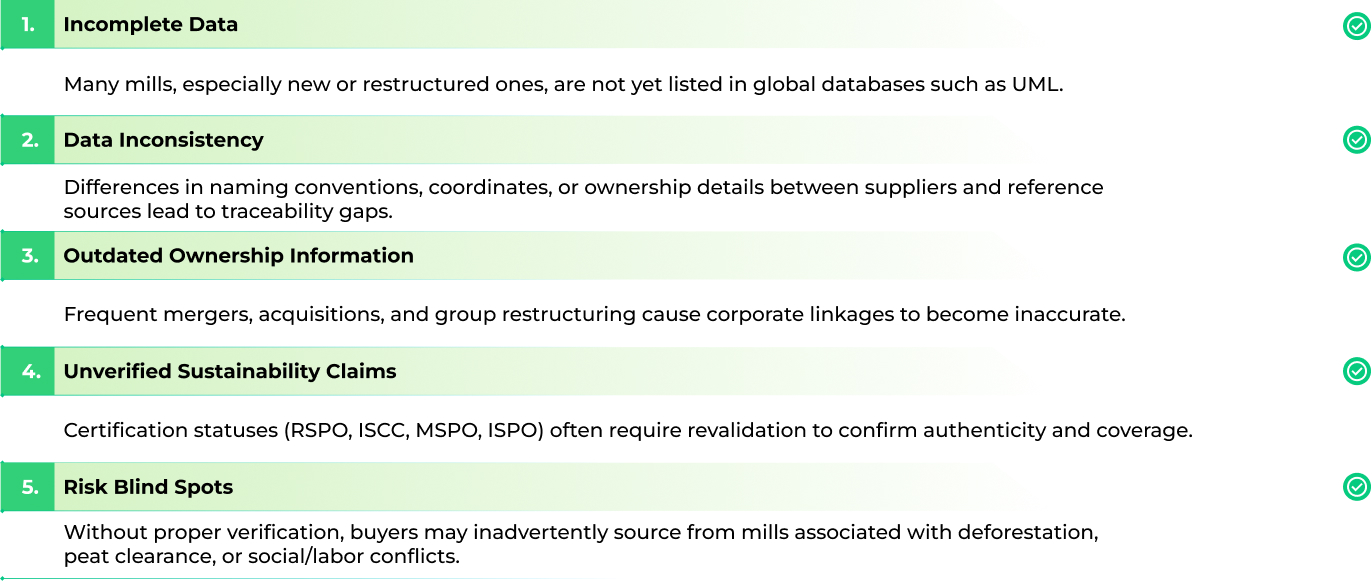 Companies purchasing palm oil and its derivatives face major challenges in verifying the origin and legitimacy of their supply sources. Supplier-provided mill lists are often incomplete, outdated, or inconsistent, making it difficult to ensure compliance with sustainability commitments and international regulations.