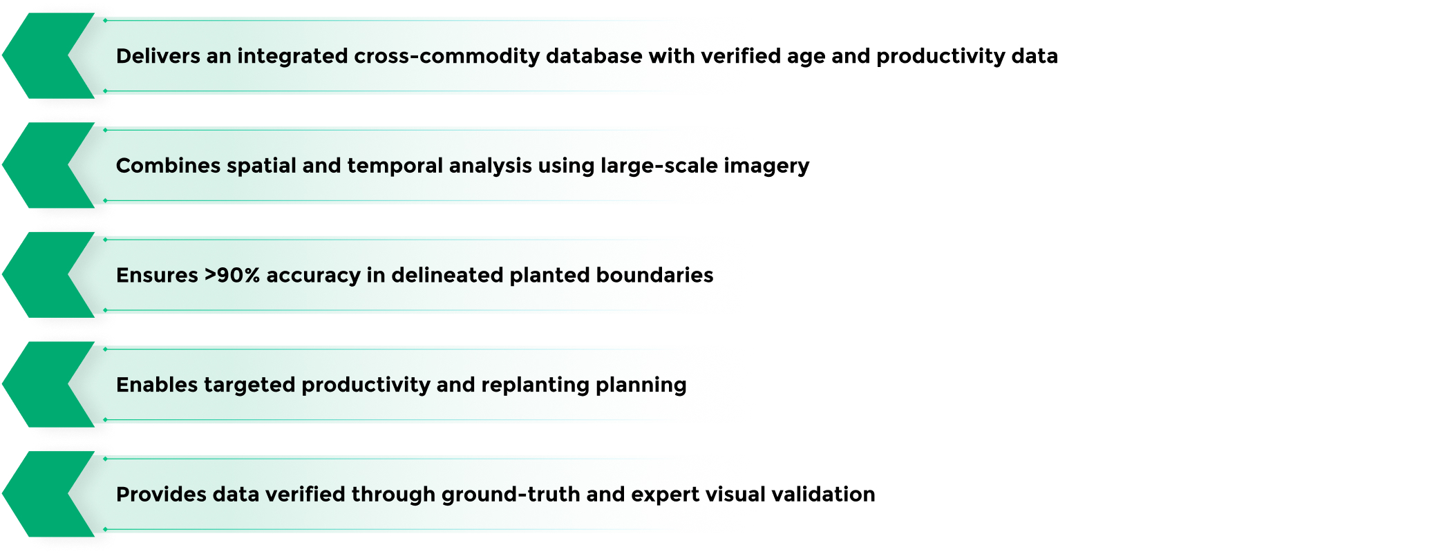 Using high-resolution satellite imagery combined with ground-verified data, the platform maps planting year, crop age, and productivity potential with over 90% accuracy. It consolidates planted area data across multiple crops, offering an integrated view of agricultural landscapes for data-based decision-making.