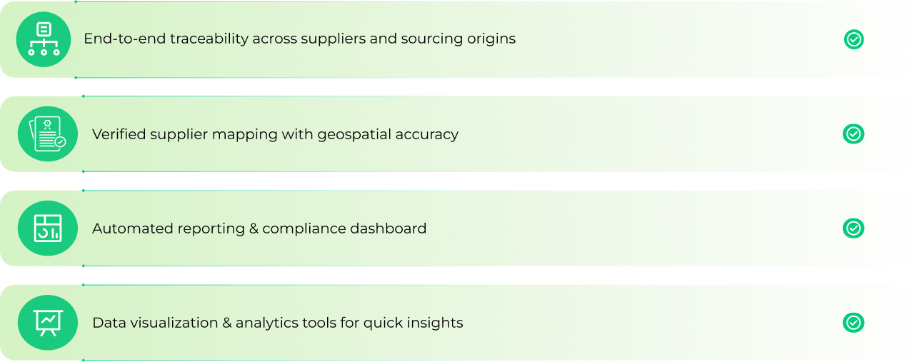 Traceability to Plantation (TTP) goes beyond mapping, it delivers real accountability. Designed as a comprehensive visibility solution, TTP tracks raw materials from plantation to processing point, enabling companies to make data-driven, credible, and compliant sustainability decisions.